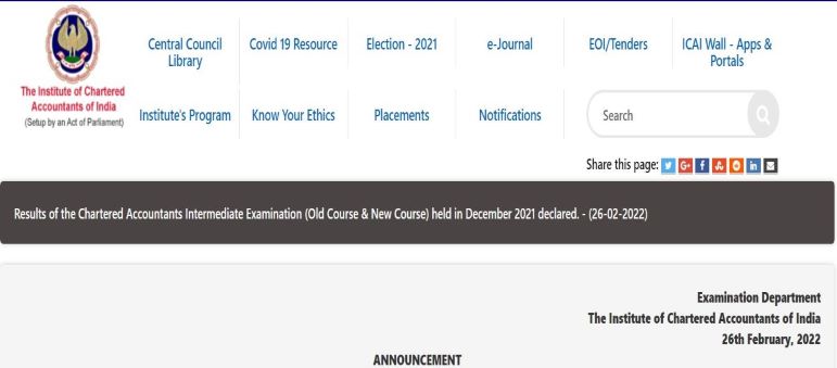 ICAI – The institute of Chartered Accountants of India has announced the CA Intermediate Dec 2021 result on Saturday, February 26, 2022. Candidates who were awaiting for the CA inter result, can check their results on the official websites of the institute at caresults.icai.org.