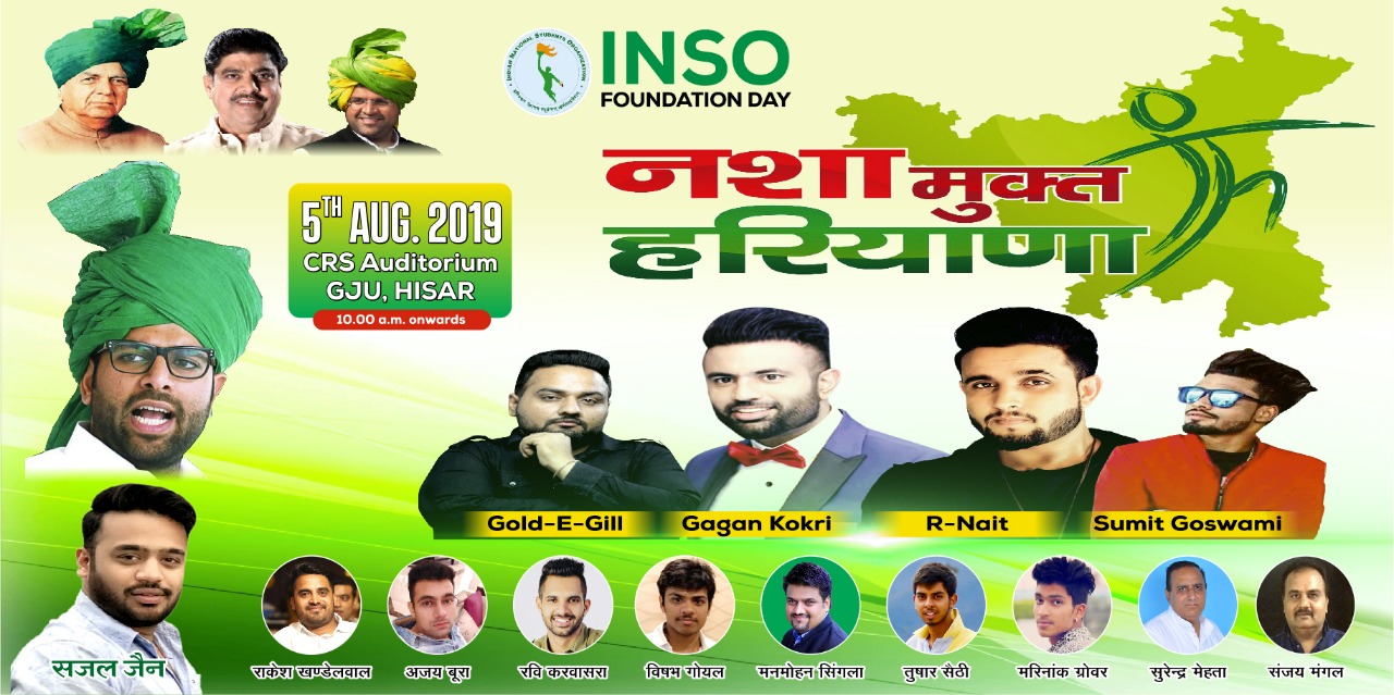 The INSO (Indian National student Organization) will celebrate its foundation day on August 5, 2019, at Chaudhary Ranbir Singh Auditorium, GJU, Hisar. The organization would be completing 11 years since its formation would hold a Drug free Haryana campaign in the town. The campaign will be inaugurated by renowned singers like Gagan kokri, Gold-e-Gill, R-Nait, and Sumit Goswami.