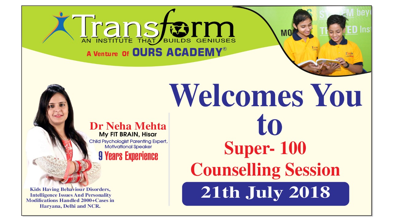 On 21st July, Transform PCCP, A venture of Ours Academy successfully organized an event SUPER 100 a Free Counselling Session for the Parents in Hisar. In the session parents got to know how to mould a child at early stage to unleash their talent. This event was felicitated in the presence of Chairman Mr.Anoop Poonia, Director Er.Suriender Poonia, Academic Head Dr.Pooja Grover and renowned counsellor Dr.Neha Mehta .In the session parents came to know about the solution of the most concerning questions before them.
